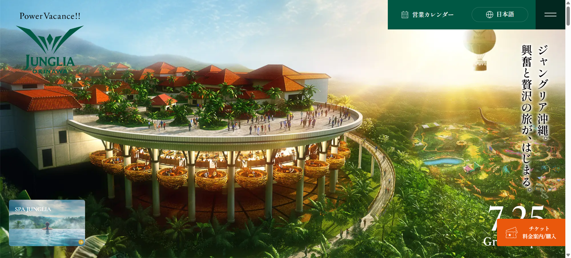 沖縄北部に誕生する、都会にはない興奮と贅沢のテーマパーク「JUNGLIA」のオフィシャルサイト。Power Vacance‼-ジャングルのエネルギーと呼応する超興奮と、都会の喧騒から離れて絶景に身